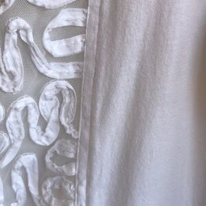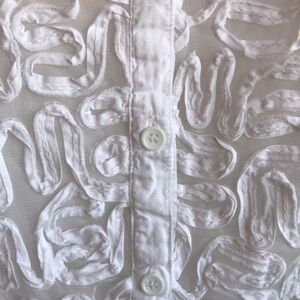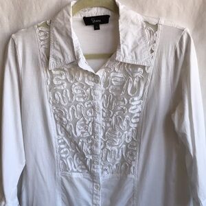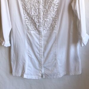 Shana white button-down 3/4-sleeve top, size L. Good preowned condition. Pretty semi-sheer detailing at neckline / chest panel. Cuffed sleeves.