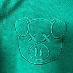 Shane Dawson Emerald Green Pig Merch Hoodie Pullover Sweatshirt in Men's size S is a stylish and comfortable option for the winter, fall, and spring seasons. This hoodie features a drawstring closure, crew neck, and long sleeves with a tight-knit fleece fabric for warmth. The graphic print showcases the logo and character design related to Shane Dawson, making it a fun and trendy choice for fans of the brand. Machine washable for easy care, this hoodie is perfect for lounging or casual outings.
