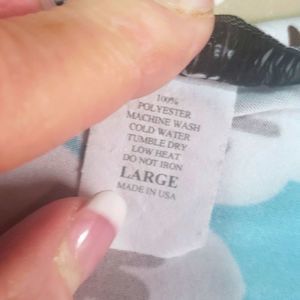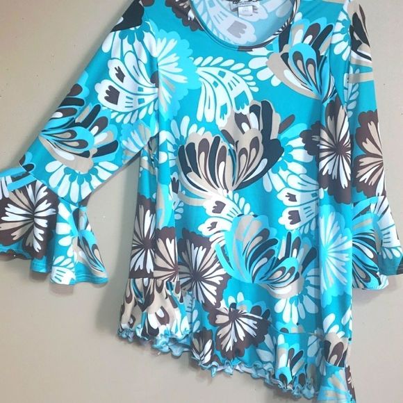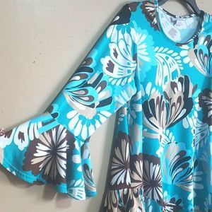 Shane Lee Inc artsy blue tan asymmetrical, bell sleeves, 4" skirt, tunic, sz L