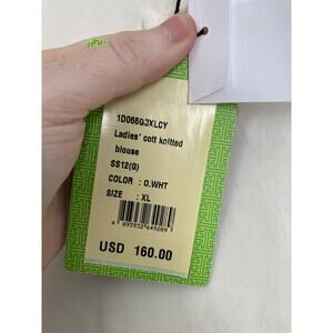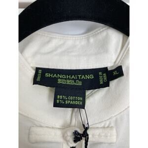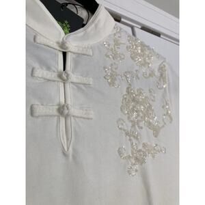 This Shanghai Tang Knitted Mandarin Top is a stylish and versatile addition to any woman's wardrobe. Made from a comfortable cotton blend with a touch of spandex for stretch, this top features a unique frog buttons closure and sequined accents for added flair. The collared neckline and short cap sleeves give it a classic yet trendy look, perfect for various occasions from casual outings to parties. The white color and solid pattern add a clean and sophisticated touch, making it a wardrobe staple for all seasons. Hand wash only to preserve its quality and ensure longevity. *Has a tiny spot on the bottom left corner as seen in picture.