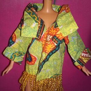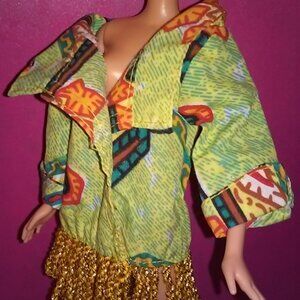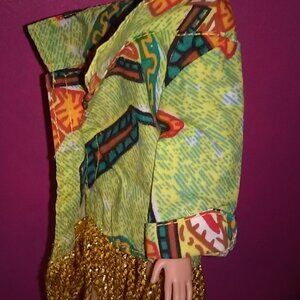 1990's Shani Doll Barbie Size Artist / Abstract Green & Orange tones Coat with Gold Fringe!