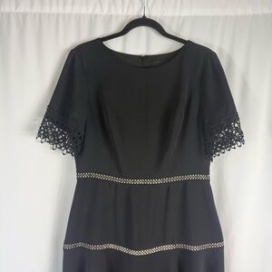 Perfect for the working, yet fun woman! This elbow length sleeve crepe dress features a fit and flare skirt and lace trim at sleeves and hem. Take this dress effortlessly from day to evening by changing your bag.