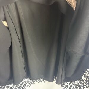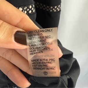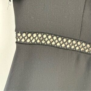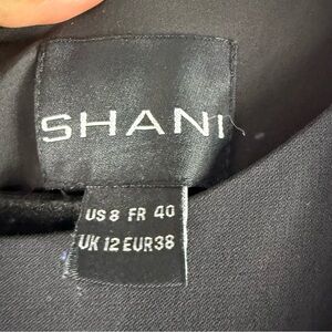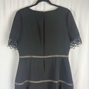 Chic black midi dress by SHAN. Features intricate lace accents. Perfect for elegant occasions.
