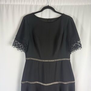 Perfect for the working, yet fun woman! This elbow length sleeve crepe dress features a fit and flare skirt and lace trim at sleeves and hem. Take this dress effortlessly from day to evening by changing your bag.