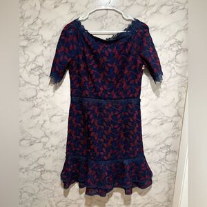 Feminine and demure, this lace dress flaunts a scallop at the neckline and short sleeves hem and a tiered flounce hem.