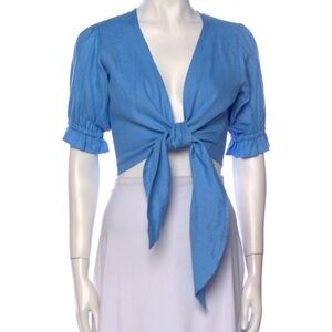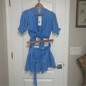 Shani Shemer Kate Puffy Sleeve Top & Sierra Short Set Linen Bright Blue Sz XS