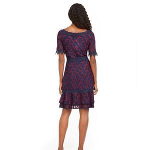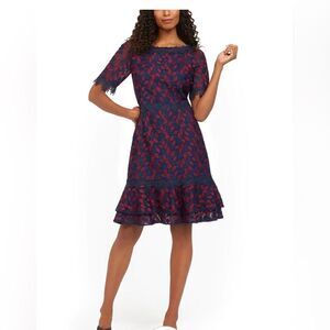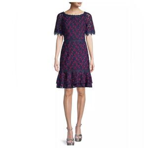 Feminine and demure, this lace dress flaunts a scallop at the neckline and short sleeves hem and a tiered flounce hem.