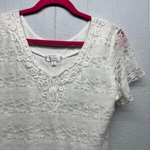 Shannon Ford juniors white lace dress. V-neck. Short sleeves. High-low hem. Lined except sleeves. Stretch. In good used condition. No stains, tears or holes.