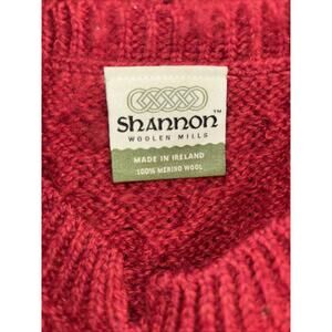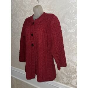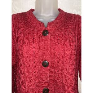 Shannon Woolen Mills solid dark red cable knit 100% merino wool long sleeve button front cardigan sweater. Features rounded neckline with three button closure at upper center front. Long straight cut sleeves. Slight a-line silhouette through body length, falling to low hip. Thick and warm cable knit wool fabric. Stretch available. Women’s size large with
