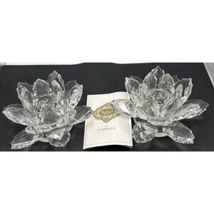 The product is a vintage pair of 3" Lotus Crystal Candle Holders, featuring a floral pattern in a round shape. Made of clear crystal with a shiny finish, these candle holders come in a pretty box packaging. Suitable for all occasions, their contemporary style adds an artistic and romantic touch to any room. With a set of two original pieces, these candle holders are perfect for adding a touch of elegance to your home decor.