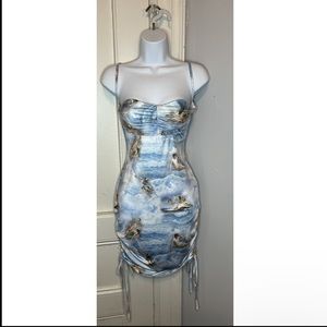 Shape Blue Renaissance Print Slinky Ruched Side Bodycon