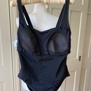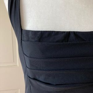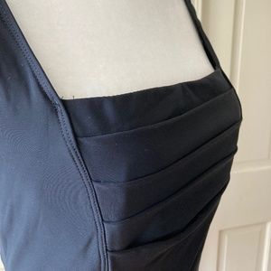 Black suit with squared neckline and four rows of pleats across the bust. Shelf bra with lightly padded cups. Fabric is 80% Nylon and 20% Spandex. SIZE 14 Worn only once. Excellent condition.