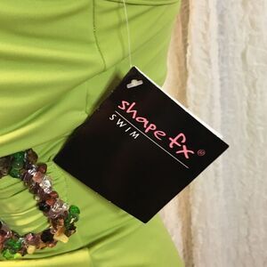 Green, faux wrap, deep V neckline one piece swimsuit. Pretty side broche on the side of waist. It’s new with tags. Please refer to pictures for best description and condition verification.