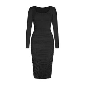 The ShapeLLX Smooth Ruched Shaping Dress in Black size 3X is a slimming and smoothing BodyCon dress perfect for various occasions such as travel, parties, or casual wear. With a solid pattern, long sleeves, and a scoop neckline, this midi-length dress is designed for plus-size women. The ruched detailing and wrinkle-resistant features add a touch of elegance, making it suitable for the winter, fall, and spring seasons. Hand wash only to maintain the quality of this stylish and flattering dress from the brand shapellx.