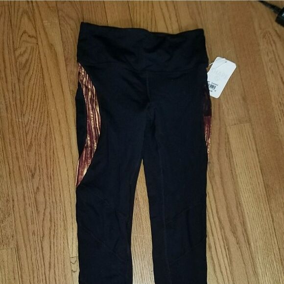 Pocket in back waistband. Breathable mash details on calves. Orange, red, brown, goldenrod colors to create a winding pattern down legs. Matching top, see separate listing.