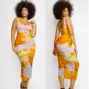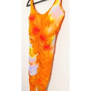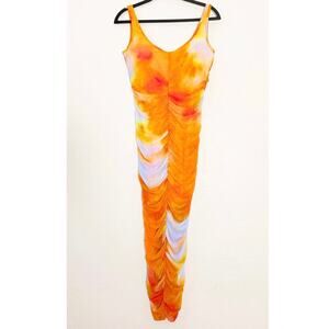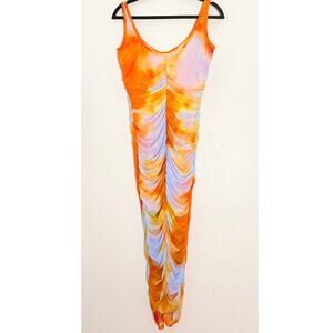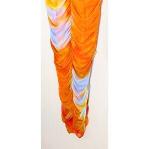 Shapellx Women's Ruched Shirred Compression Bodycon Mesh Maxi Dress Orange Tie Dye Built In Bra Removable Pads NWT
