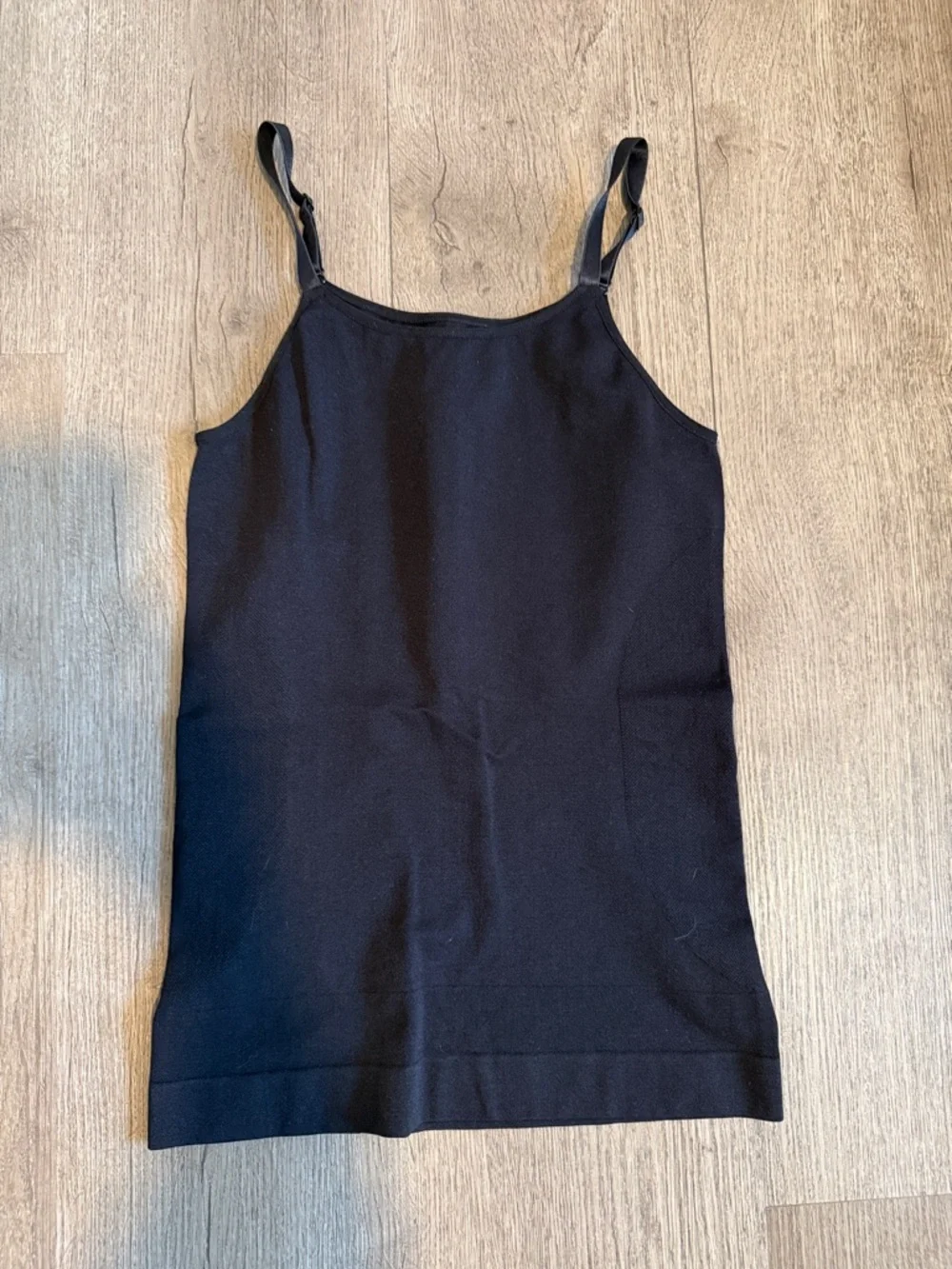 Simple black cami with thin adjustable straps. Sleek ribbed fabric for a smooth fit. Versatile layering piece. Easy everyday wear.