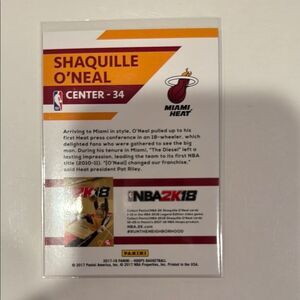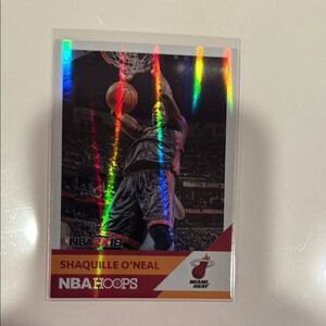 Collect the iconic Shaquille O'Neal trading card featuring the Miami Heat. This card showcases vibrant colors and a dynamic action shot, perfect for any basketball fan.