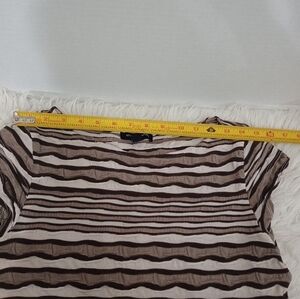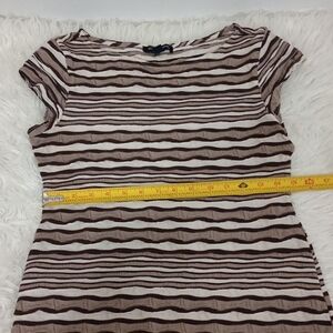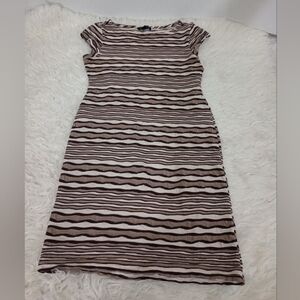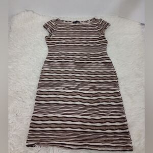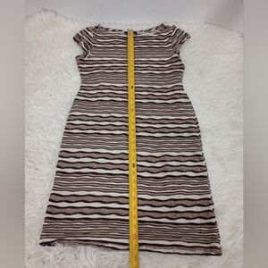 This midi sheath dress showcases a lovely cream and brown color palette with horizontal stripes in varying shades of brown. It features short cap sleeves and a classic crew neck, making it an ideal choice for casual outings or work settings. The soft fabric drapes beautifully, ensuring comfort and style throughout the day.