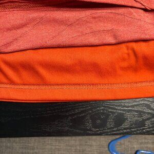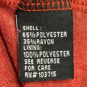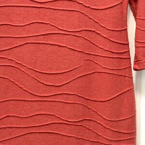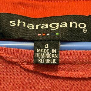 Sharagano Bodycon Dress. Rust. 3/4 sleeves. Size 4. Fully lined (lining 100% polyester). Scoop neck. Dress is 65% polyester, 35% rayon. Approx. measurements: pit to pit 17", shoulder to bottom 38", waist 15" across front. Textured wave pattern. Excellent preowned condition. No flaws.