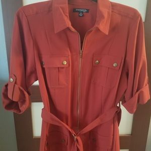 The classic shirtdress is timeless and ever so popular! This 3/4 sleeve dress with zip front and self belt is RUST colored. It's knee length with snap detailing. Size 16w.
