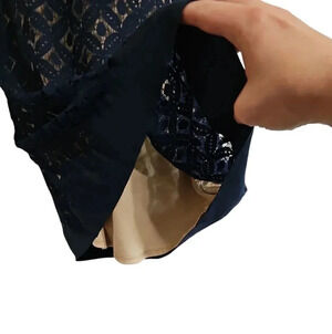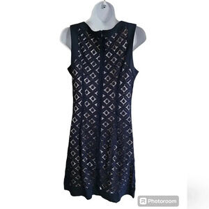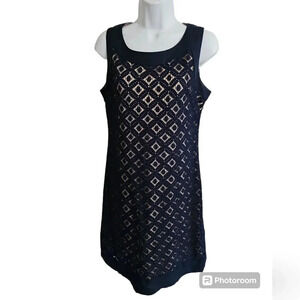 Sharagano size 6 sleeveless navy shift dress with a gold diamond cutout overlay. Fully lined. Classic mod silhouette with a luxury vibe—perfect for cocktails, weddings, or upscale nights out.