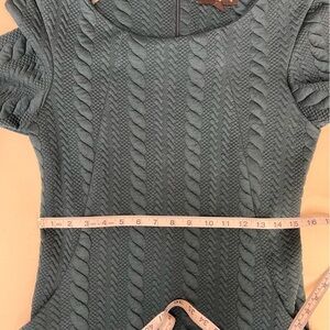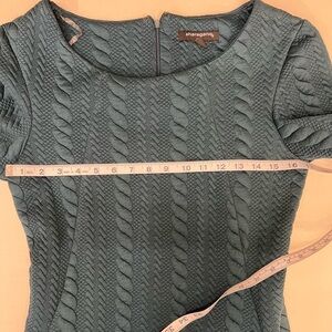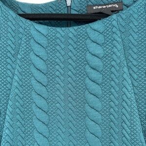 Sharagano Teal Cable Scuba Dress Size 8. Beautiful teal dress in a comfortable, forgiving scuba material. It has pockets! This would be the perfect dress for the office, church or a winter wedding paired with a pair of tall boots! This dress is in excellent pre-owned condition. Please see photos for details and approximate measurements and feel free to ask questions!