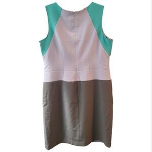 Sharagano colorblock sheath dress in a size 14. Gray bottom with lighter gray on top and Teal color around armholes. Center back zipper. Lined. Excellent condition.