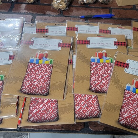 The product is a set of 20 extra large Christmas gift bags by Regent Products. The jumbo red and white HO HO HO bags come with ties for easy closure. These plastic gift bags feature a festive Christmas pattern, making them perfect for wrapping and gifting presents during the holiday season. The large size provides ample room for wrapping big gifts, while the classic red and white colors add a touch of Christmas cheer. Ideal for gift-giving and adding a touch of holiday spirit to your presents.