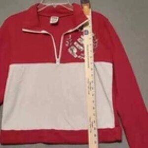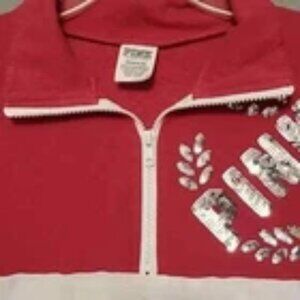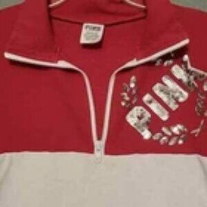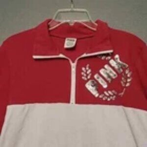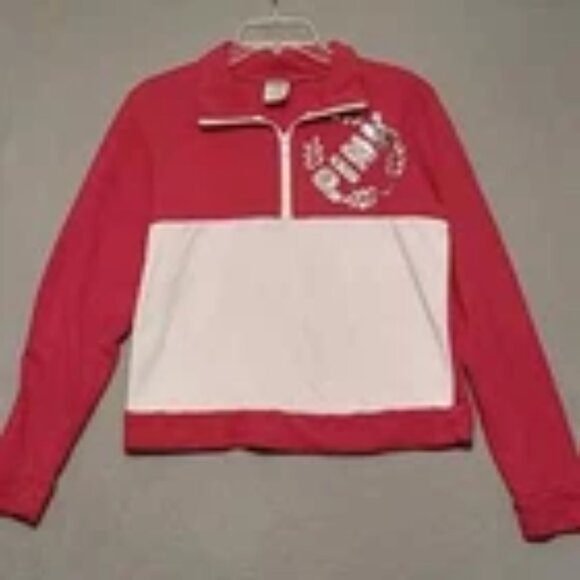 The product is a Victoria's Secret PINK Quarter Zip Sweatshirt in size small, featuring a colorblock pattern with a sequin logo accent. This pullover sweatshirt is designed for activewear, with long sleeves and a zip closure for easy wear. Made from a blended fabric, this pink sweatshirt is a stylish and comfortable addition to any woman's wardrobe, representing the Victoria's Secret PINK product line. Perfect for a casual yet chic look, this sweatshirt is a versatile piece for any outfit.