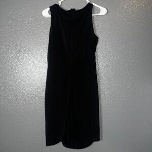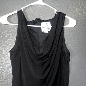 Elegant black sleeveless dress with a draped neckline and side ruching for a flattering silhouette. Back zipper closure for a sleek fit. Perfect versatile piece for cocktail parties, date nights, or as a timeless little black dress for special occasions.