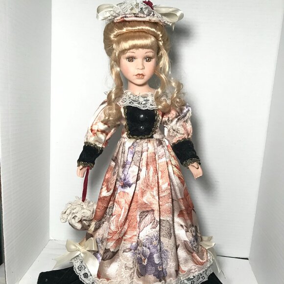 Share Vintage 90s Blonde Curly Hair Victorian Dress Doll 18 Inches with Stand