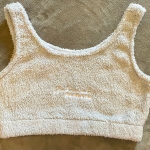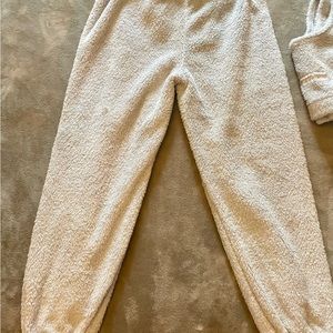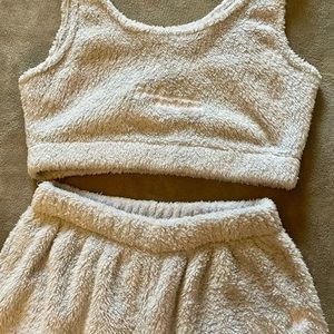 I purchase this at a boutique shopping event. It is new and never worn. Super super soft and fuzzy. Can be worn while out running errands or lunch with friends. Or cozy up in this comfy cozy set while at home relaxing. Color is a light blue and has a heart shape on left side/hip of pants.