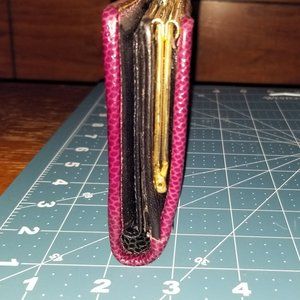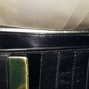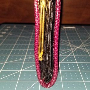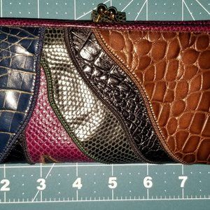 A 1980's checkbook, wallet, coin purse in bright colored stamped leather by Sharif. This has never been used, but is a bit dusty (sorry, wasn't visible until I began taking photos thanks to the flash). The original gold spacers/card examples are still in the credit card slots.