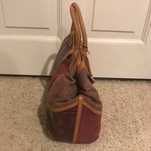 Stylish Sharif bag with a mix of textures. Features burgundy and tan panels. Elegant design with sturdy handles.