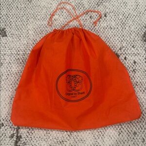 Bright orange fabric dust bag. Features black Original by Sharif logo printed center. Drawstring top closure. Simple and bold accessory.