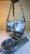Sharif Silver leather studded shoulder bag with removable adjustable crossbody bag. Front zip pocket. Zipper top closure will lock onto tab at rear. Red faux suede interior with one open and one zip pocket