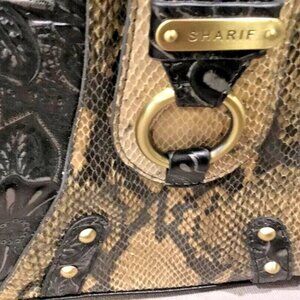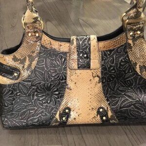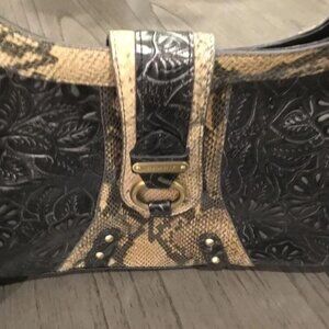 Sharif Studio, early 2000s handbag, western boho, tooled floral leather, faux python trim, vintage satchel, tassel accents, black and tan purse, cowboy core, eclectic glam, Y2K fashion, statement accessory