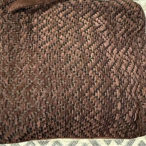 Brown suede woven bag with gold accents. Zip around closure, one interior zip pocket. Ideal for versatile use. Beautiful bag!