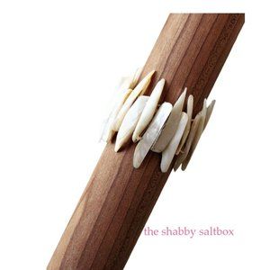 Very unusual Mother-of-Pearl (or Abalone Shell) "Shark Bite" stretch bracelet. This statement piece bracelet is eye catching and sure to get attention. Natural shell is creamy ivory with brown veins. Size is XS-S. I have a 5.5 inch wrist and I can wear it without gaps in the shells. Sometimes it does pinch!
