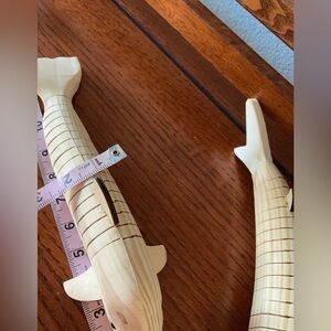 Two articulating wooden sea toys. One shark, one dolphin. Each 12 inches long by approximately 3 inches wide. These move side to side. One turtle approximately 4“ x 5“ that acts like it’s crawling moving. All of these can be either painted or stained. These are new, never played with.