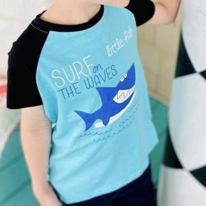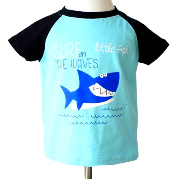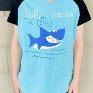 Blue w/ Black Raglan Sleeve Shirt/Vinyl Imprinted Shark "Surf on the Waves Little Fish"
