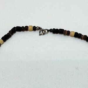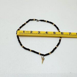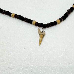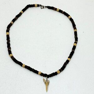 This unique necklace features a tribal-inspired design adorned with alternating black and beige coconut beads. The real shark tooth pendant adds an intriguing touch, offering a glimpse into the ocean's mysterious depths. Its clasp closure ensures a secure fit, making it a captivating accessory for those who appreciate distinctive and bold jewelry choices.