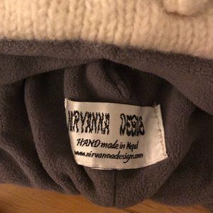 100% wool outside lined with super warm and cozy gray fleece, covers ears and stays on little heads!