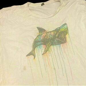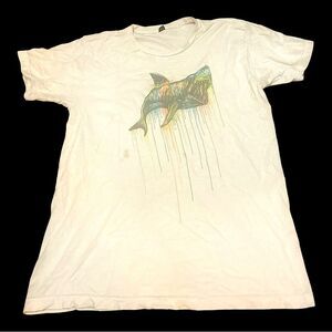 A cool outfit for sale. 2 piece bundle features a pair of 12.5 Oz. grey quality denim 5 pocket Jeans from ASOS with knee holes. Size 32x32, a little bit too long for me but perfect for unpredictable weather. Also included this beautiful distressed off-white T-shirt with 🦈 colorful shark graphic.