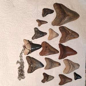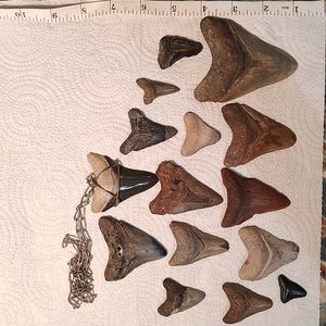 15 different sizes of sharks teeth. I'm not sure but I believe they were glued to something.