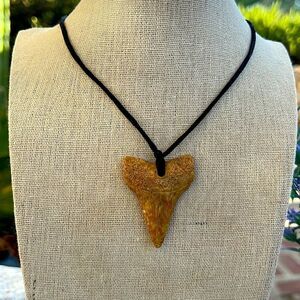 Faux shark’s tooth necklace in detailed resin/acrylic. Fairly large at slightly over 1.75” long by slightly under 1.5” wide.