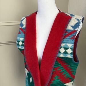 Sharon Young Sportswear 90’s Southwestern Blanket Vest, made in the USA and crafted with rich, warm tones and intricate geometric patterns. Featuring a bold red lapel and a classic wool-blend tapestry design, this piece channels true retro western flair with a cozy, artisanal finish.