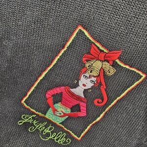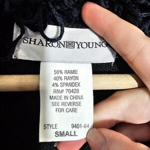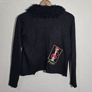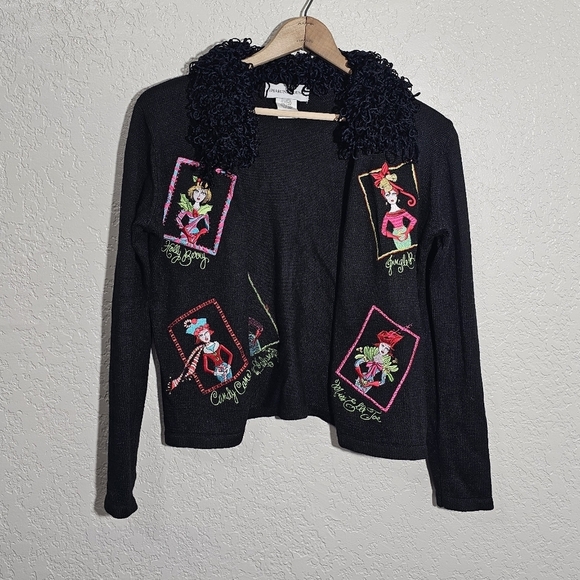 Pre-owned Sharon Young cardigan, size small. It's made of a ramie/rayon/spandex blend fabric that's fairly lightweight with a little stretch, no closure in the front, has a frilly collar, and it comes in a black knit with a fun holiday pun embroidery.