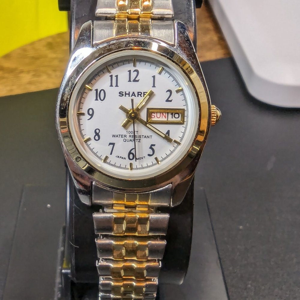 Sharp SHP13 Womens Watch Silver/Gold Tone 25 mm case with day and date. New battery. Excellent condition.